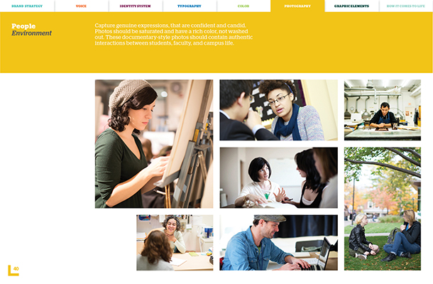 Working with an external consulting firm, I assisted in developing a new style guide to coincide with a rebranding of the university. The process involved the creation of guidelines for identity, color palettes, personality, typography, and visual elements.